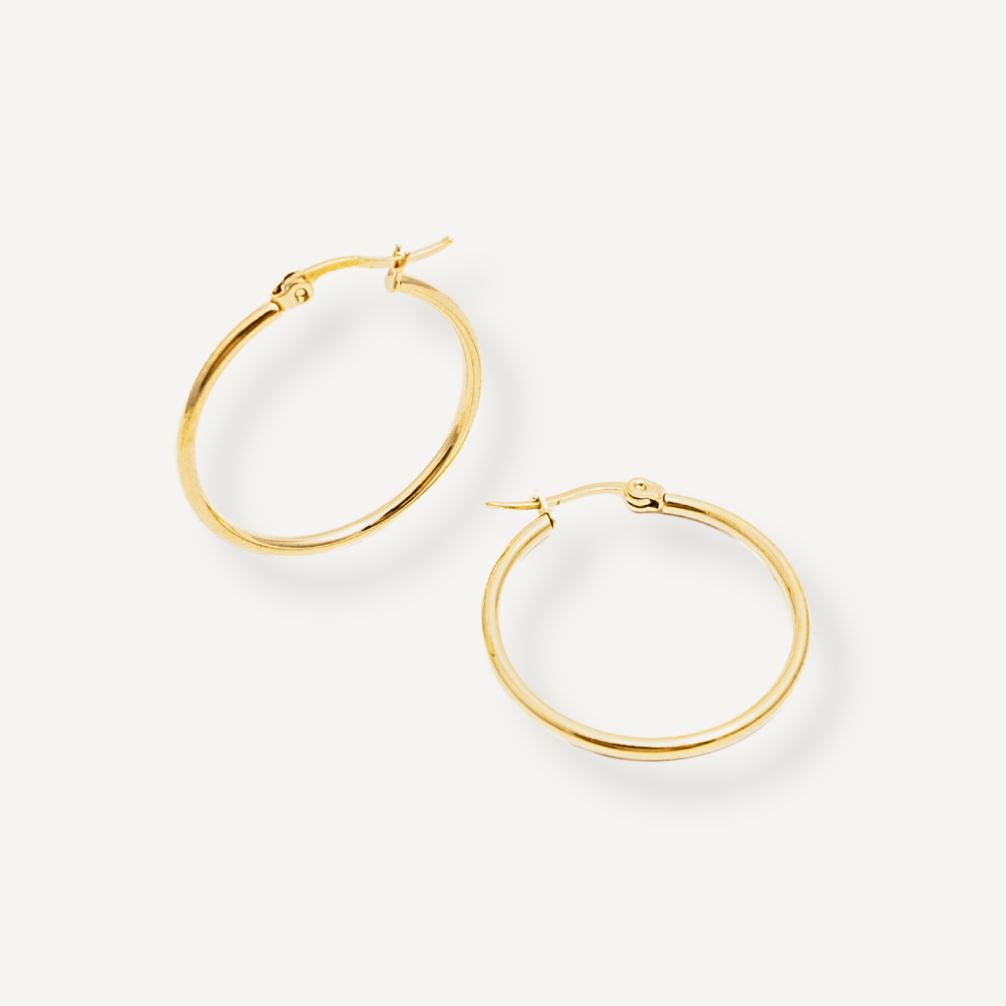 AUDREY HOOPS combine elegant design with practical durability, crafted to resist water and tarnish for lasting shine. Their hypoallergenic material ensures comfortable wear for sensitive skin, making them a perfect everyday accessory that stays beautiful and irritation-free all day long. Elevate your style confidently with these dependable, chic hoops.