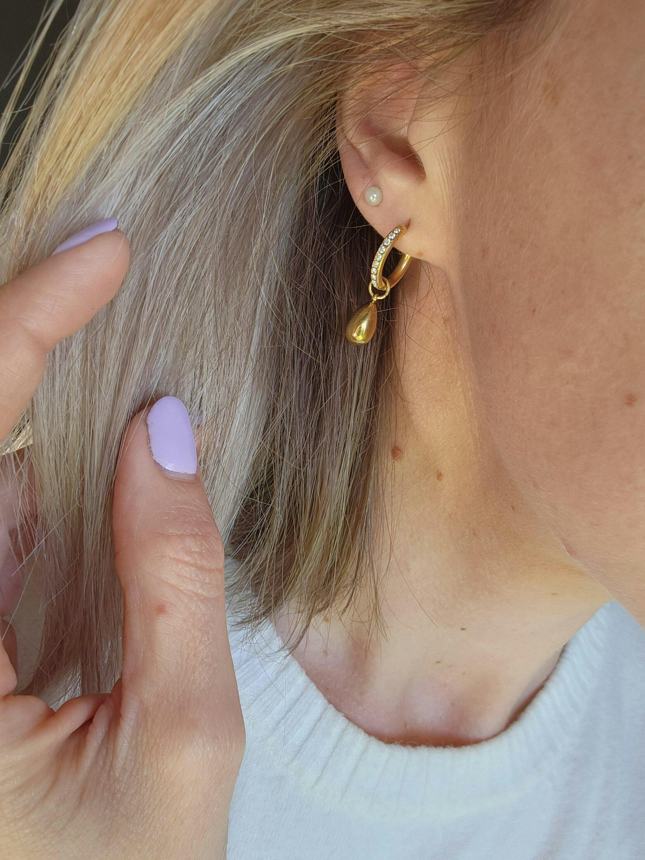 The Champagne Dangle Hoops sparkle with AAA-grade cubic zirconia stones while offering a lightweight, hypoallergenic design for all-day comfort. Crafted to be waterproof and tarnish proof, these elegant hoops maintain their radiant shine, making them a perfect statement piece for any occasion.