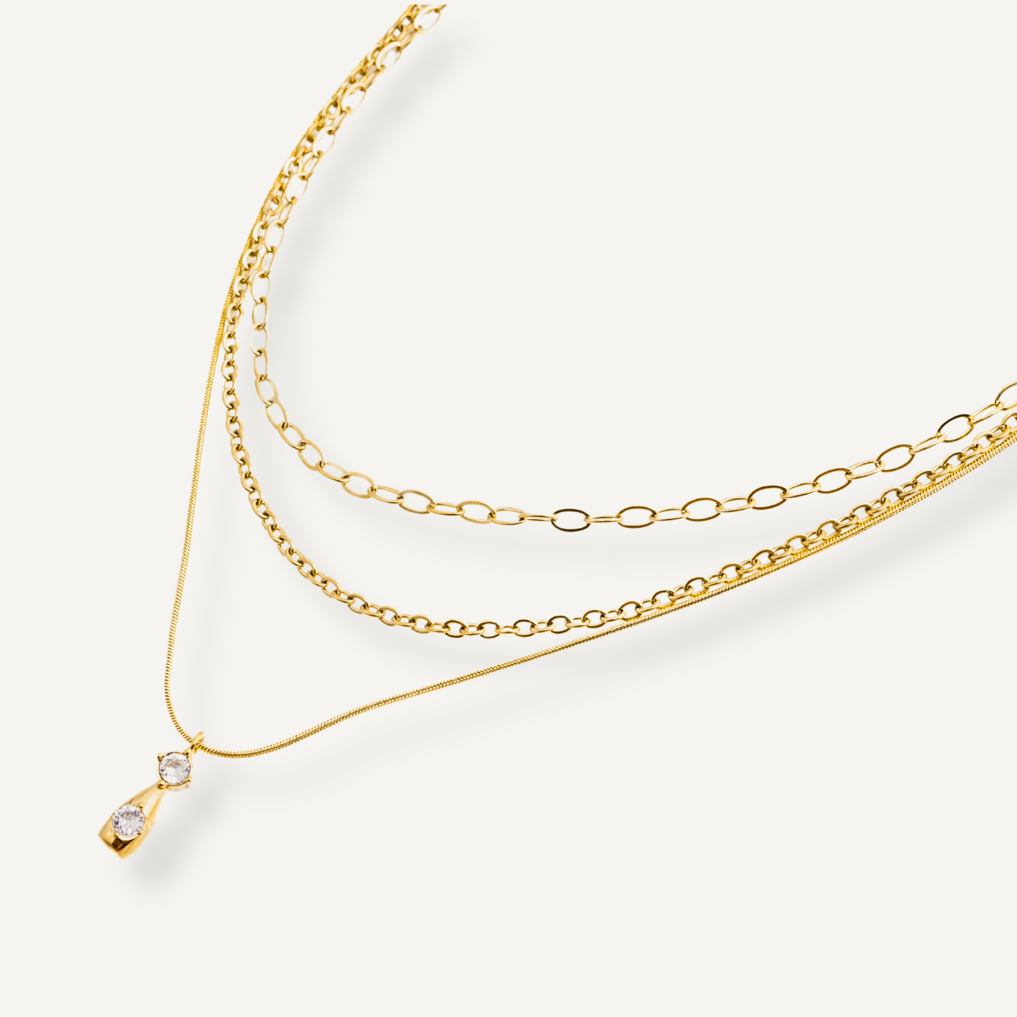 Elevate your everyday style with the Clara Necklace Stack, featuring two brilliant CZ stones set in tarnish-proof stainless steel. This pendant combines timeless elegance with durability, designed to maintain its lustrous shine through daily wear. Hypoallergenic and effortlessly sophisticated.