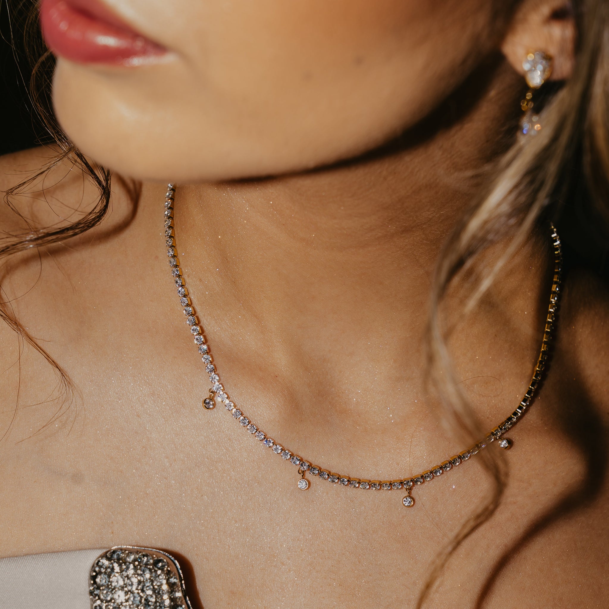 The Cassandra Tennis Necklace features AAA-grade cubic zirconia stones with brilliant sparkle. Water and tarnish-resistant, hypoallergenic design ensures lasting elegance and comfort for everyday wear and special occasions.