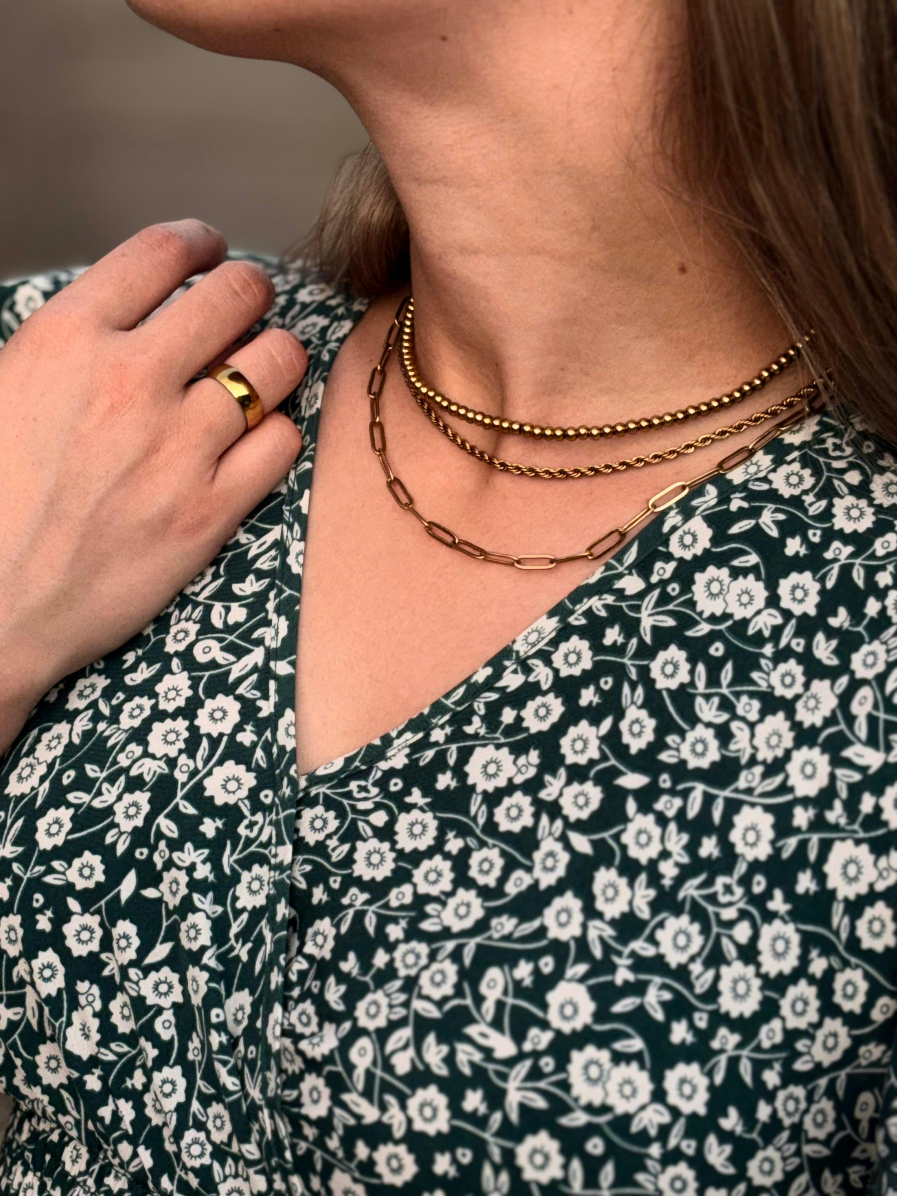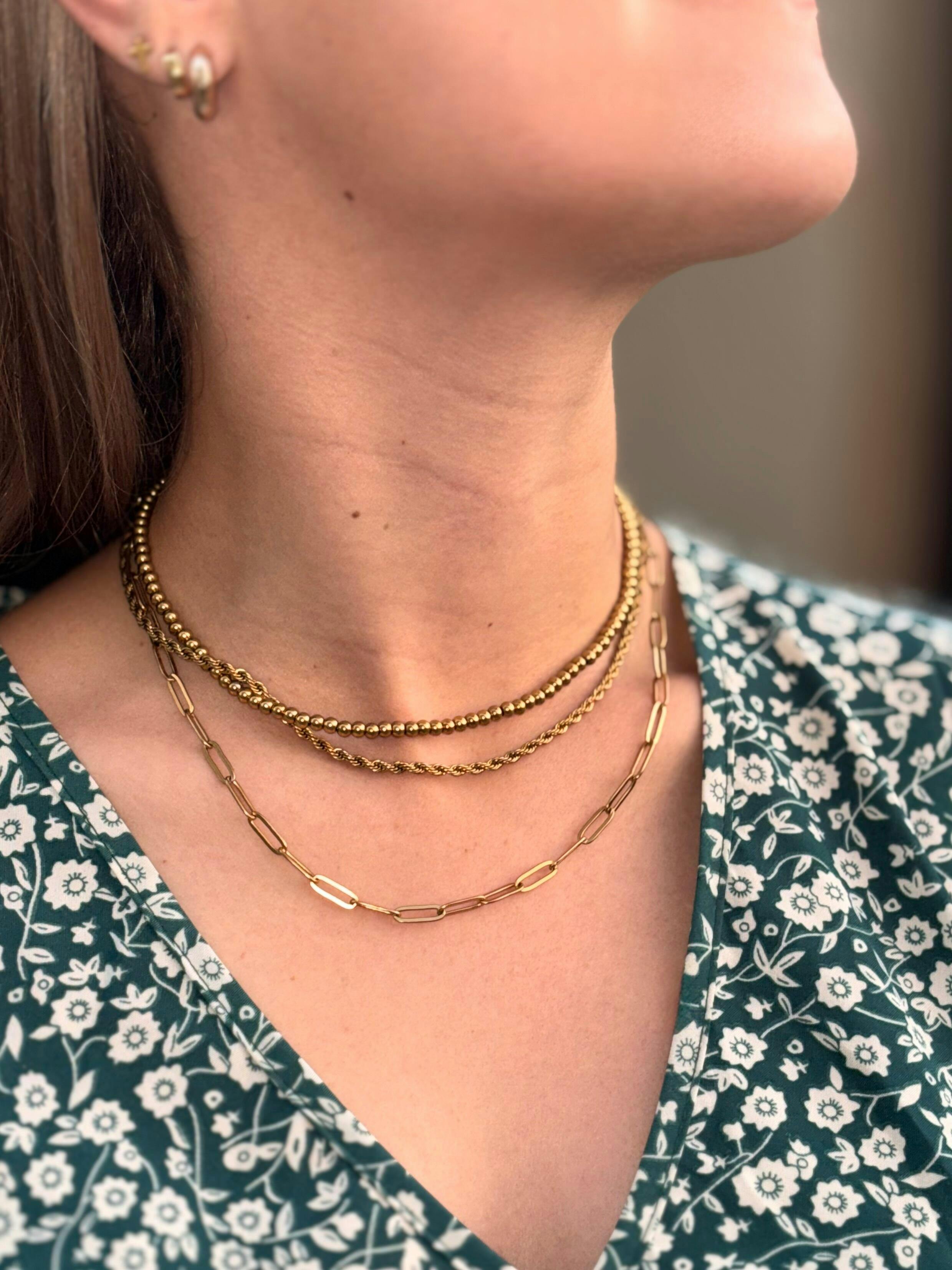 The Allegra Necklace Stack presents layered sophistication in one cohesive design. Water and tarnish-proof construction preserves its refined appearance through daily wear, while hypoallergenic materials ensure comfort for sensitive skin. A complete statement piece that embodies timeless elegance.