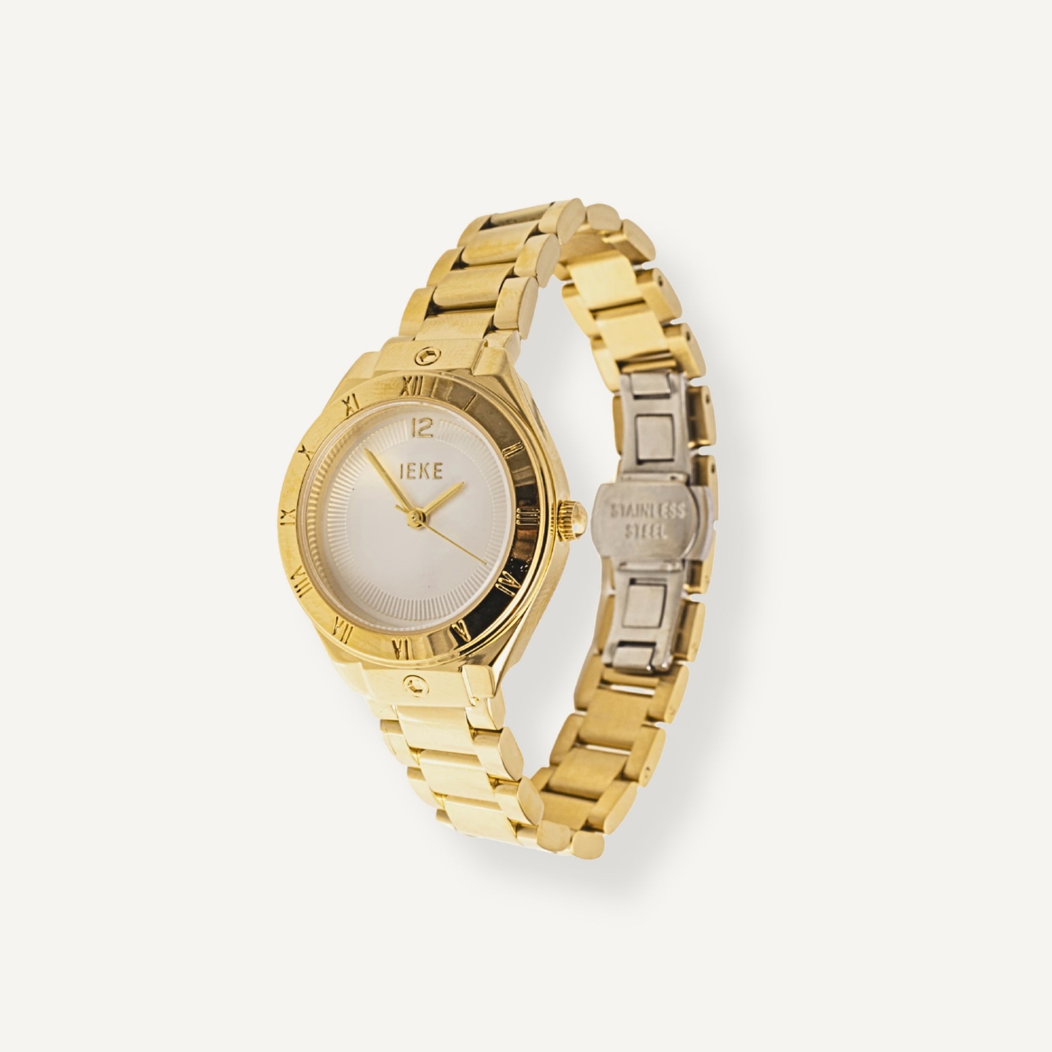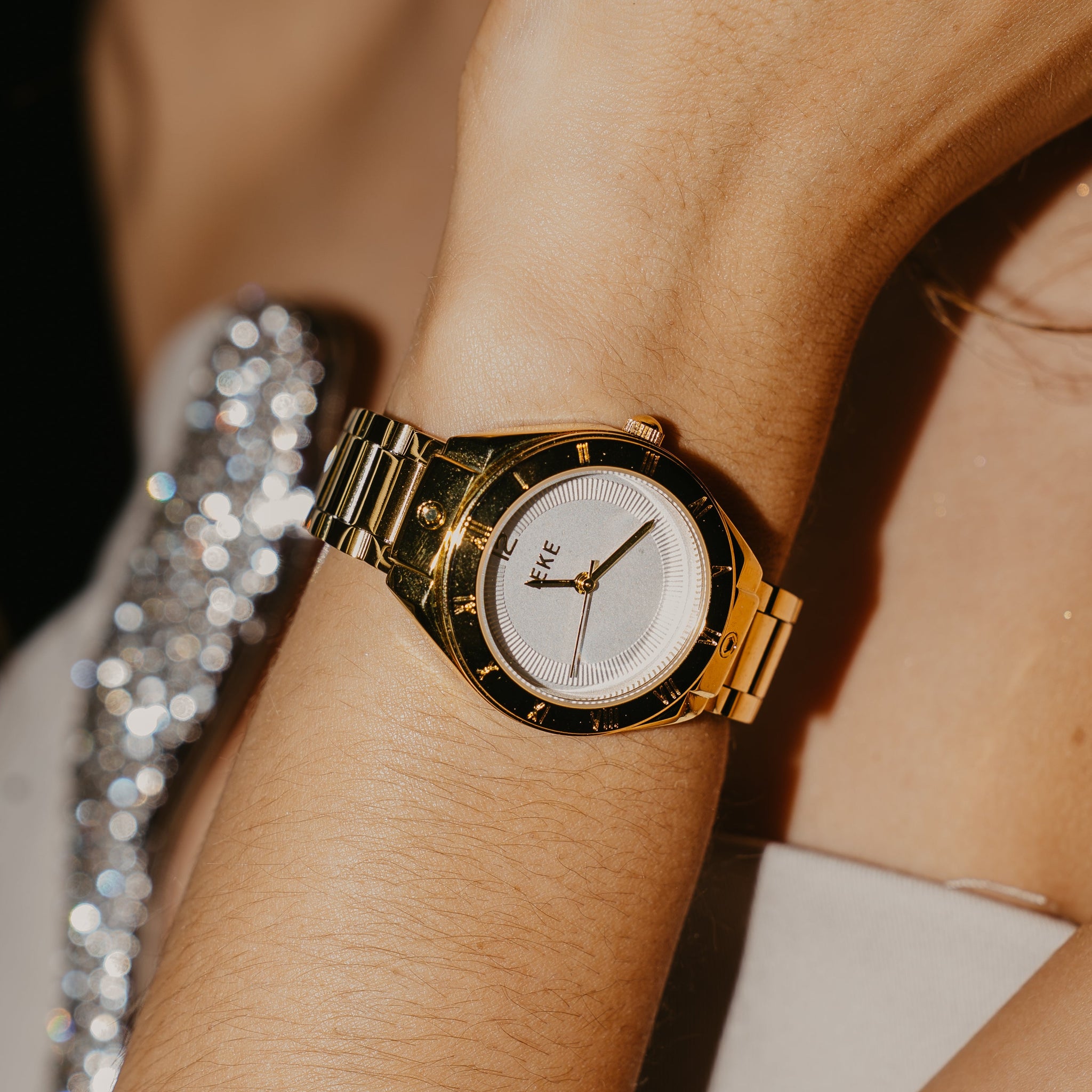 THE CHAMPAGNE epitomises refined elegance with its robust stainless steel construction and dependable quartz movement. Water and tarnish resistant, this sophisticated timepiece maintains its lustrous appeal through years of wear. The adjustable bracelet ensures a graceful fit for any wrist, making it an effortlessly versatile companion for life's most distinguished moments.