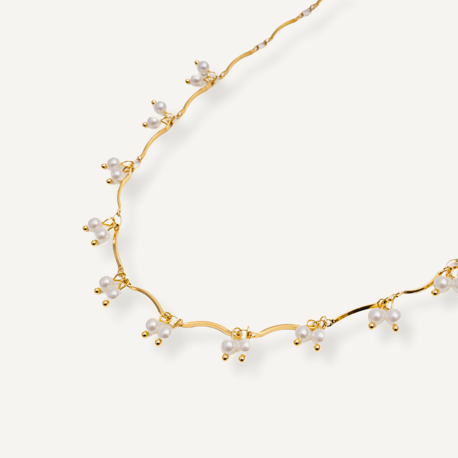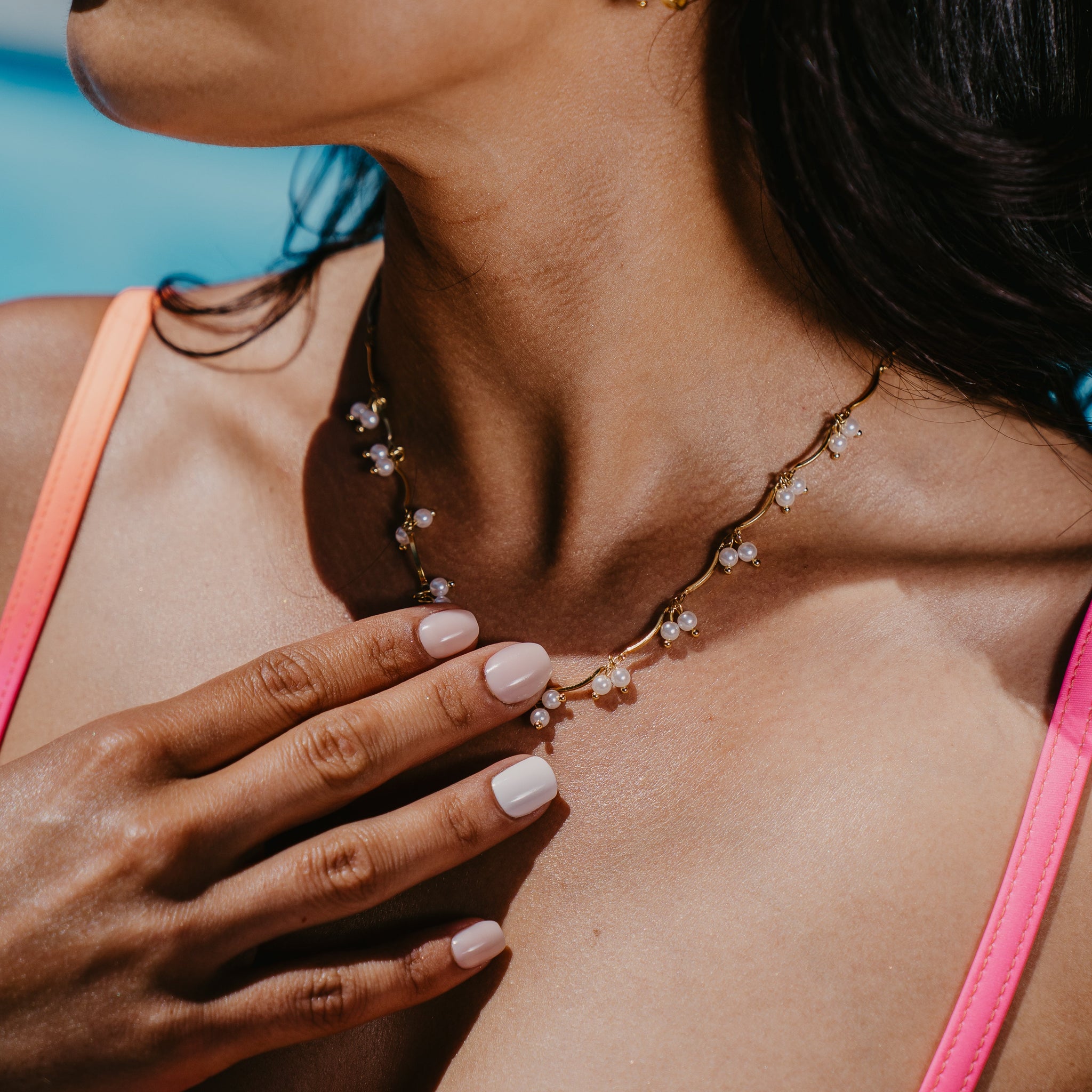 Capture the fresh allure of summer with the CAPRI PEARL NECKLACE, featuring delicate pearl dangles that add graceful movement and elegance. Water and tarnish proof, this necklace offers lasting shine and sophistication, making it the perfect accessory to elevate your sunny-day ensembles.